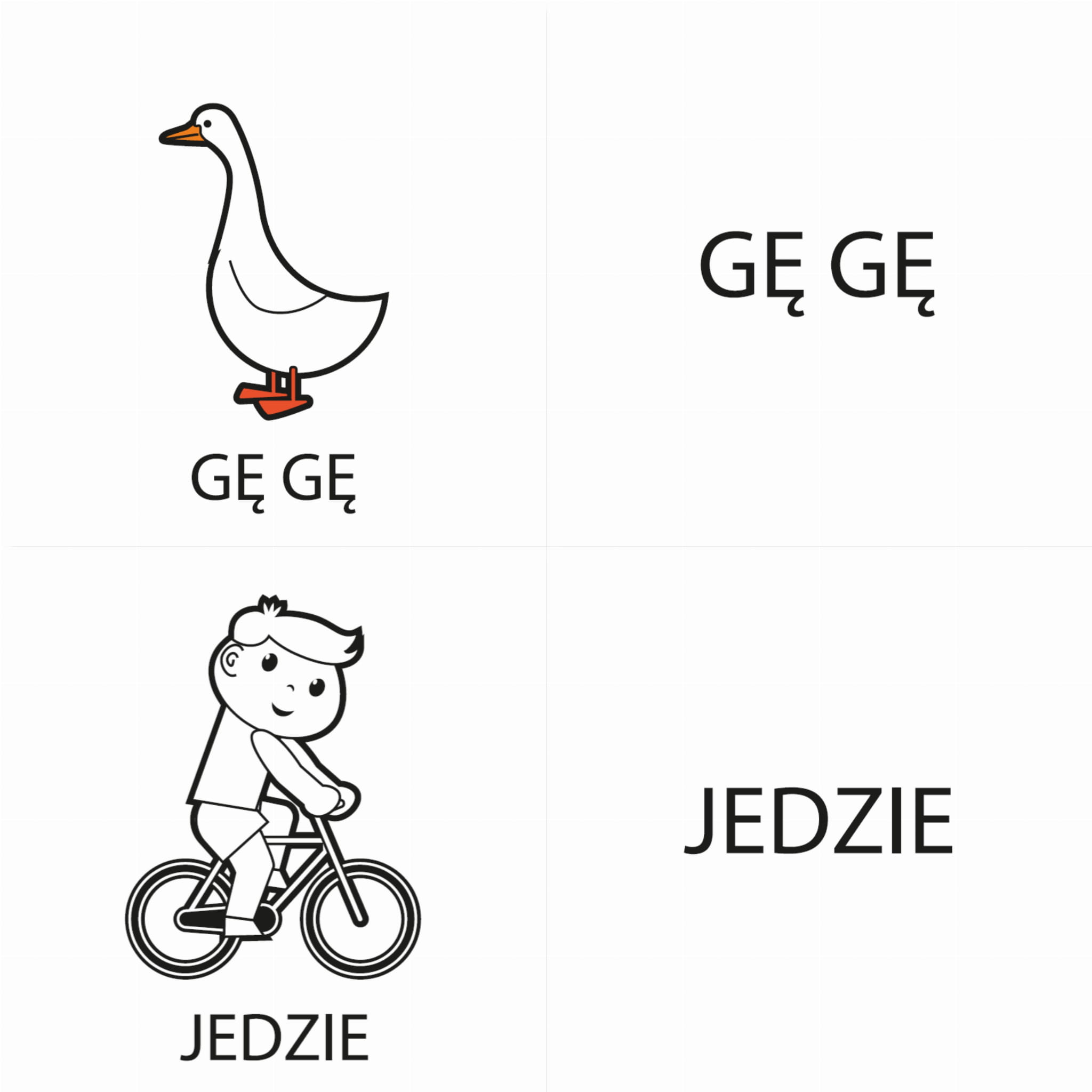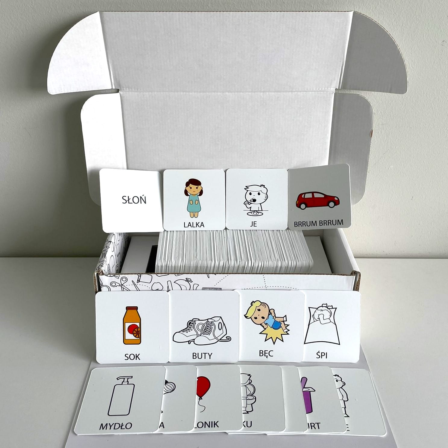 Wybrane słowa dla najmłodszych zostały wykonane w kolorze. Pozostałe z uwagi na potrzeby kontrastu w technice czarno białej. Każda karta zawiera obrazek, słowo napisane wielkimi literami i samo słowo powtórzone na drugiej stronie.